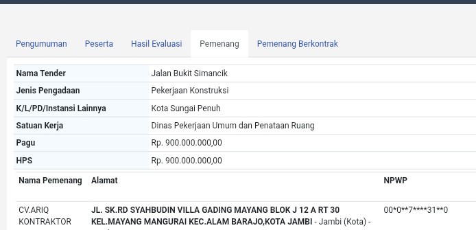 Hal diketahui dari laman LPSE Kota Sungai Penuh, dikerjakan oleh CV ARIQ KONTRAKTOR. Nama Tender: Jalan Bukit Semancik. Satuan Kerja: Dinas PUPR Kota Sungai Penuh. Pagu: 900.000.000.00,