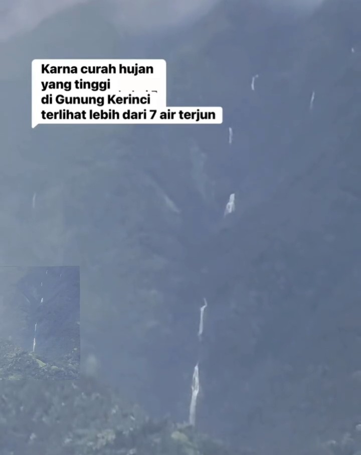 KERINCI-Sebuah Video yang diunggah oleh akun Facebook @Arbadost Firmansyah, memperlihatkan tujuh titik air terjun di lereng Gunung Kerinci. Didalam rekaman video berdurasi 0:38 detik itu, direkam saat hujan di Gunung tertinggi di Sumatra.
