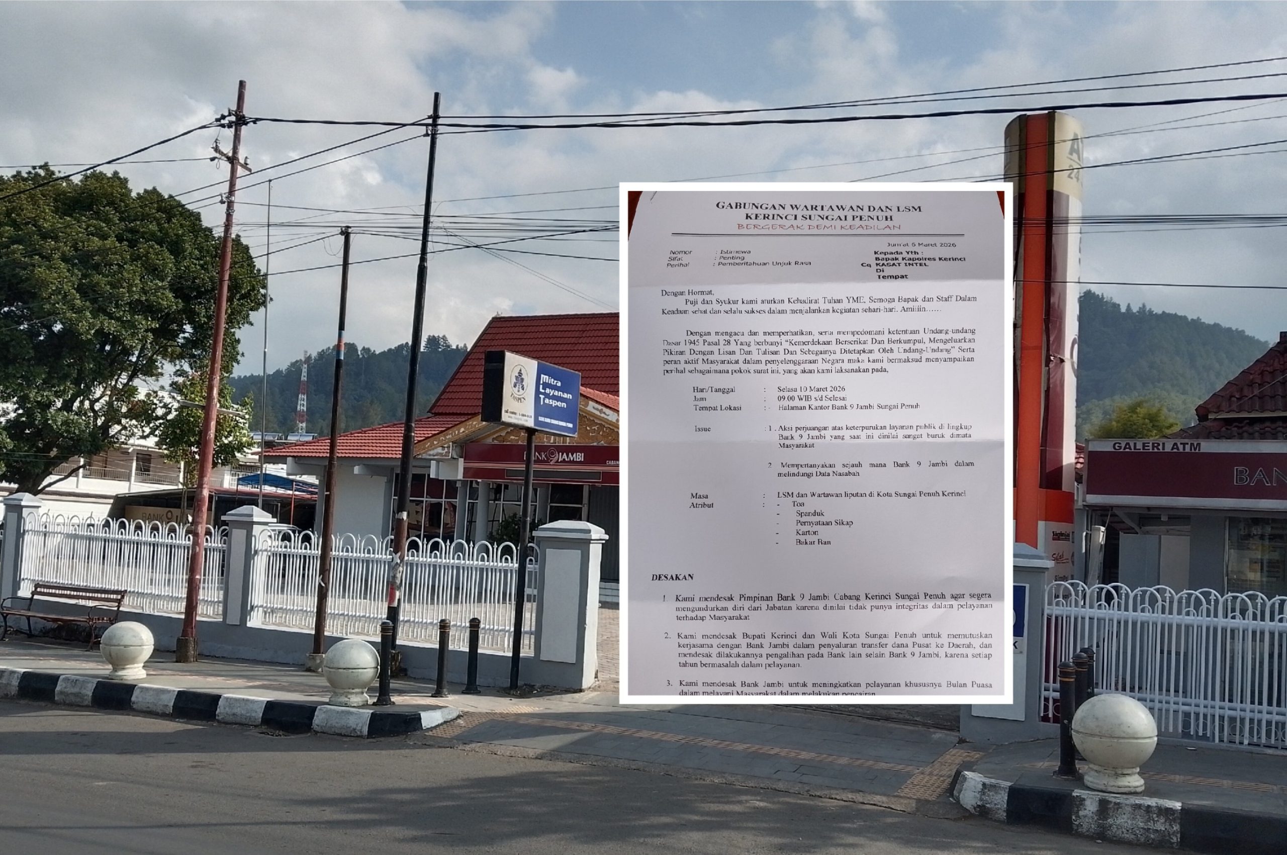 1. Kami mendesak pimpinan bank 9 Jambi Sungai Penuh agar segera mengundurkan diri dari jabatan karena dinilai tidak punya integritas dalam pelayanan terhadap masyarakat.